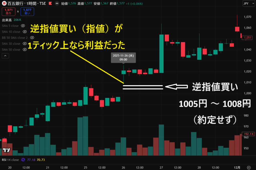 実例:約定せず (逆指値買い(指値)が1ティック上なら利益だった)