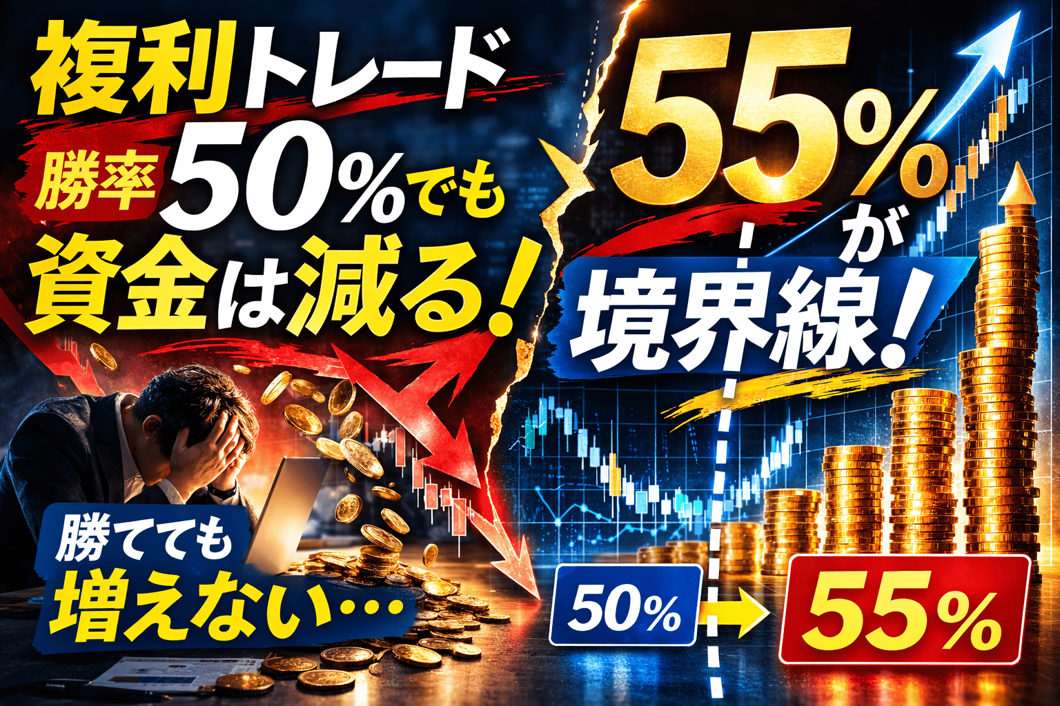 この違いを知らないまま、「半分勝っているから大丈夫」と考えると、複利トレードでは口座残高がガンガン削られます。