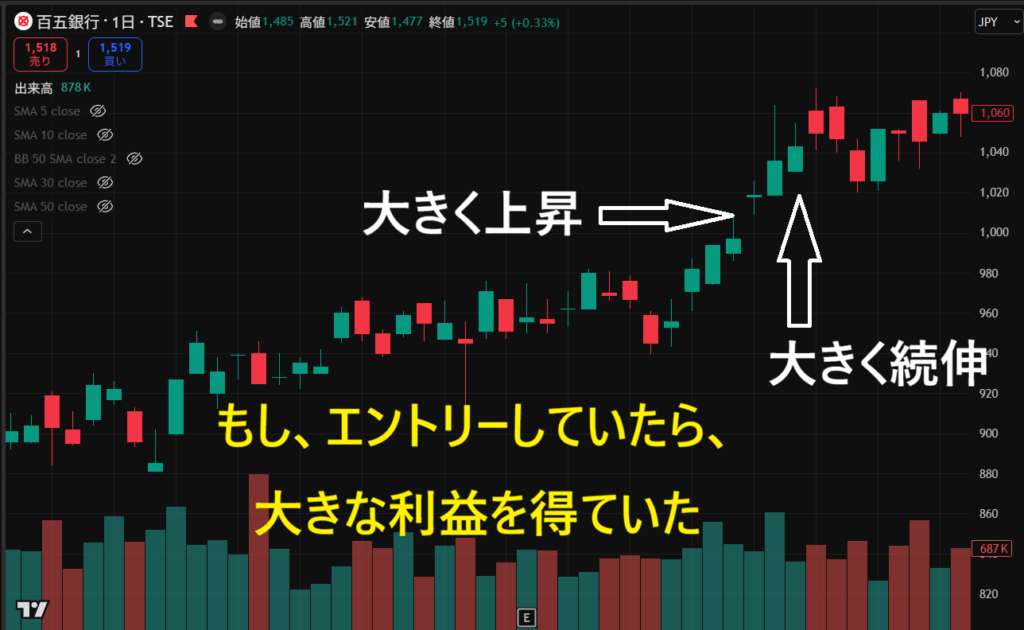 結果論ではあるが、窓開け後だろうと、エントリーしていたら、大きな利益を得ていたのです。